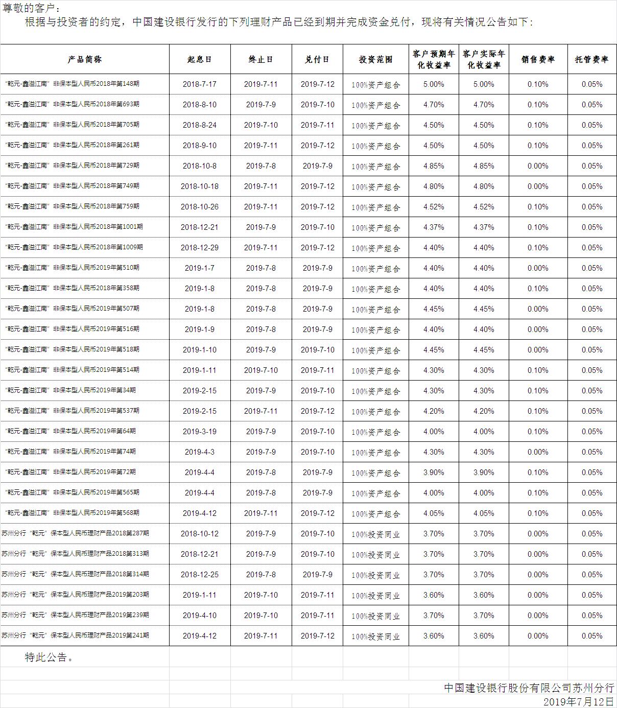 中国建设银行理财产品终止及清算公告