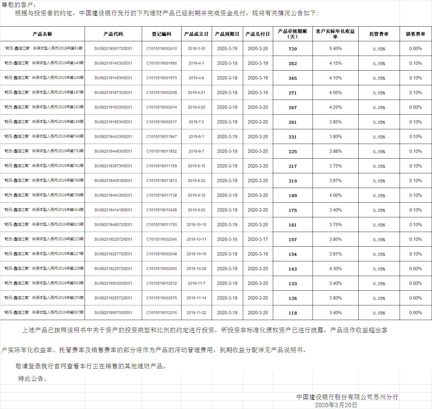 中国建设银行理财产品终止及清算公告
