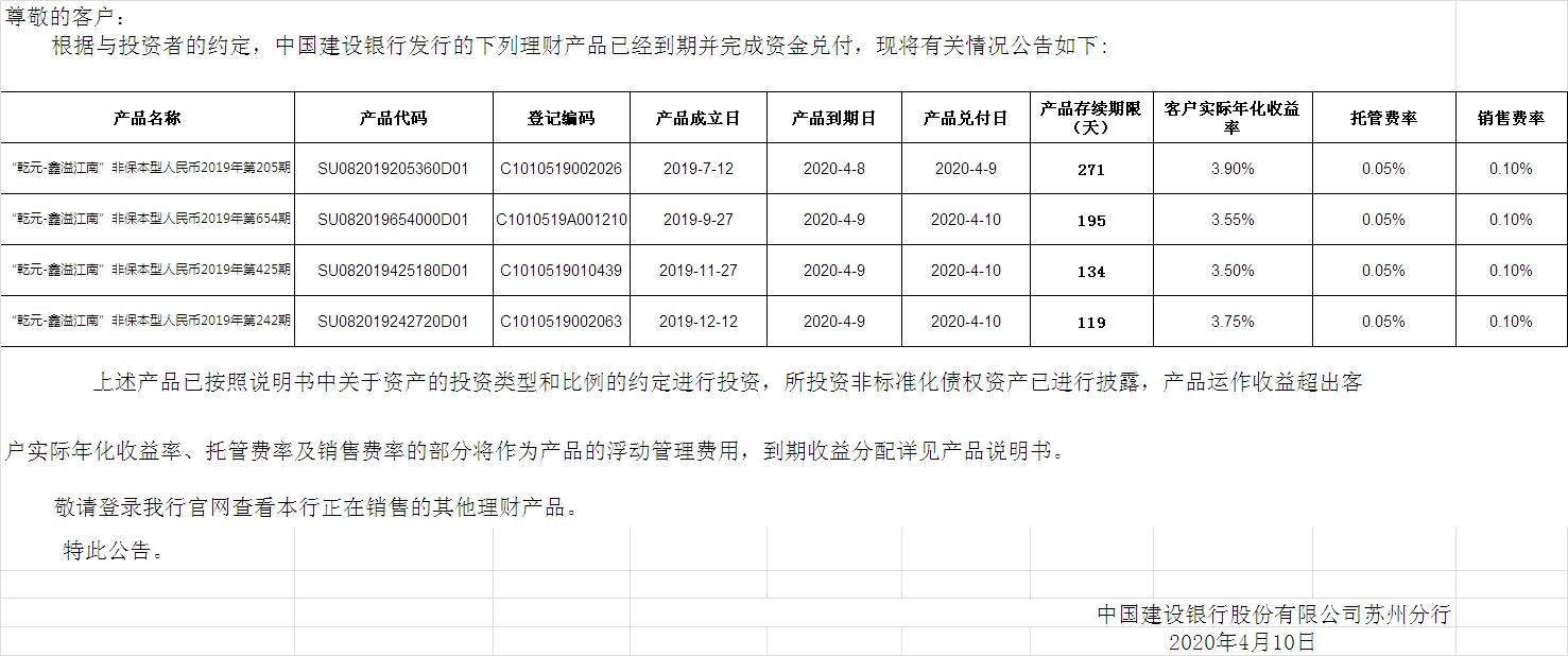 中国建设银行理财产品终止及清算公告