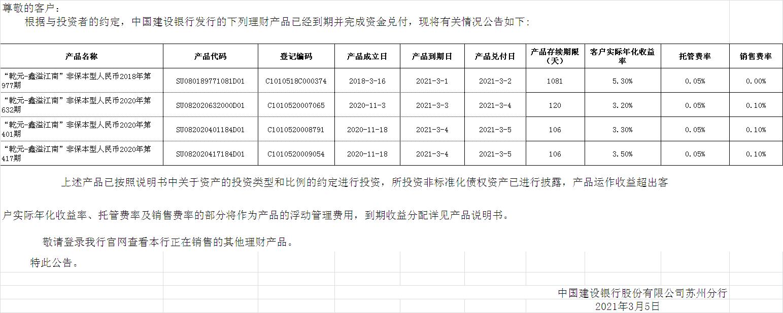 中国建设银行理财产品终止及清算公告
