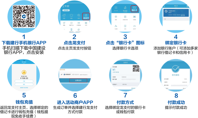 4.建行龙支付绑定他行卡的客户,可通过绑定的他行借记卡向龙支付钱包充值,并使用建行龙支付钱包余额扫码支付享受活动优惠。使用建行龙支付绑定的他行信用卡扫码支付无法享受活动优惠。